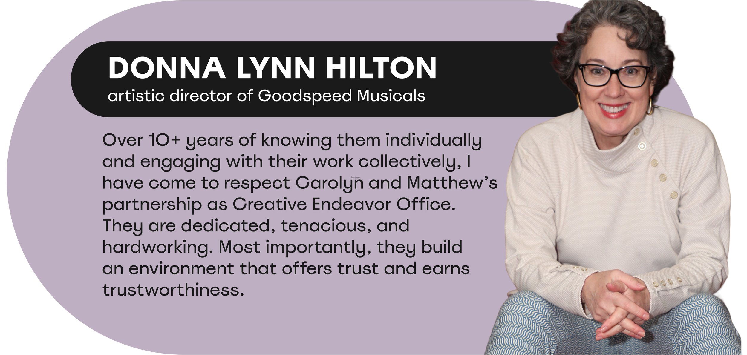 Owners and Co-Founders Matthew Schneider and Carolyn D. Miller have a combined forty years experience in the arts and entertainment industry, and are experts in the cultivation, development, and production of new works for the live stage. Their work has been seen on Broadway, Off-Broadway, and on international stages. Using the immensely powerful tools of story and shared experience, Matthew and Carolyn seek to affect a positive impact in the world through the development and production of art and entertainment. Our friends tell us we’re doing pretty good: